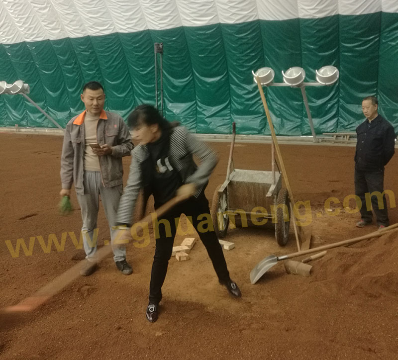 施工現(xiàn)場(chǎng)拍攝,紅土運(yùn)動(dòng)場(chǎng)地建設(shè)要求很高,紅土不同于其他材料的施工。中國(guó)現(xiàn)在運(yùn)動(dòng)場(chǎng)地已經(jīng)越來(lái)越多的開(kāi)始使用紅土施工建造,紅土場(chǎng)地是“軟性球場(chǎng)”是一種多孔滲水的網(wǎng)球場(chǎng)地,華蒙運(yùn)動(dòng)場(chǎng)地公司是國(guó)內(nèi)較早的并且有自己技術(shù)研發(fā)團(tuán)隊(duì)和紅土網(wǎng)球場(chǎng)建造工藝專利權(quán)的紅土網(wǎng)球場(chǎng)建造公司